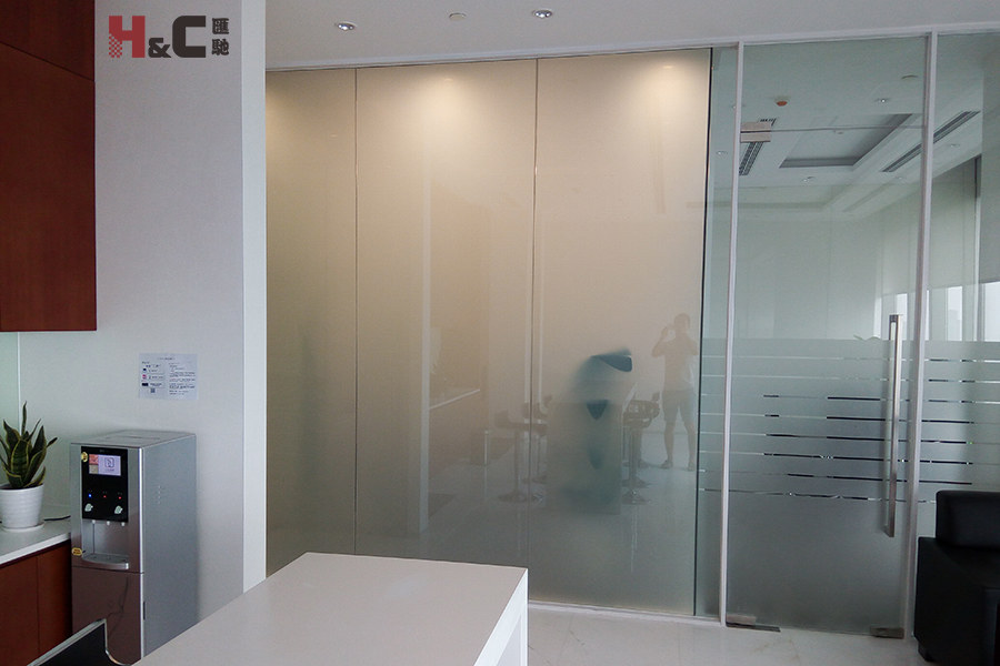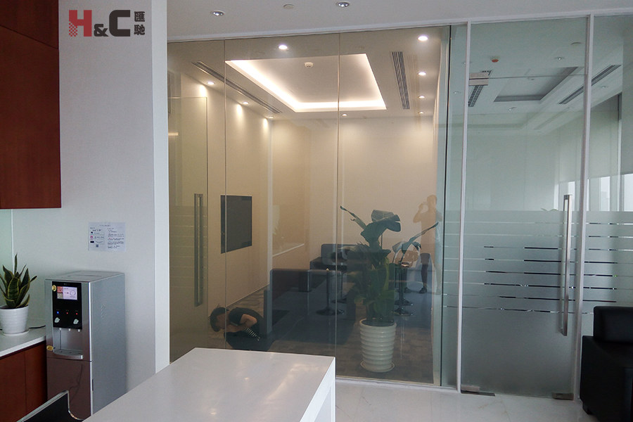 創興銀行的辦公室隔斷應用了我公司的智能調光玻璃。