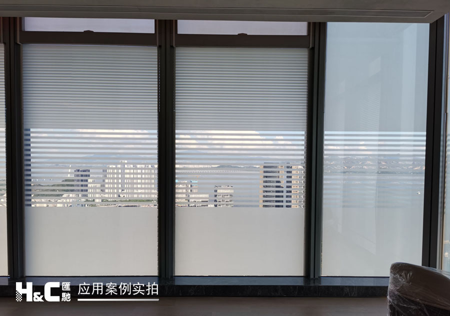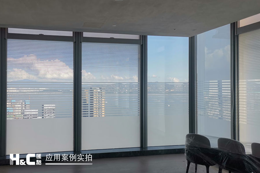 外立面的玻璃采光極好,但有時(shí)室外復(fù)雜的光線也會(huì)對(duì)室內(nèi)造成困擾。本案業(yè)主采用了廣州匯馳實(shí)業(yè)提供的百葉調(diào)光膜,貼在玻璃內(nèi)表面,讓普通玻璃變成調(diào)光玻璃。百葉的變化效果可以用遙控調(diào)控,有效控制光線的進(jìn)入,讓玻璃變得更有科技感。